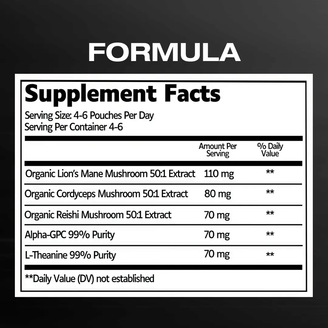 Lion's Mane (50:1 Extract) for rapid cognitive enhancement & neuroprotection Alpha-GPC (99% Pure) for memory, learning & mental processing L-Theanine (99% Pure) for alert calm without anxiety Cordyceps (50:1 Extract) for natural cellular energy & endurance Reishi (50:1 Extract) for stress regulation & sleep-friendly calm